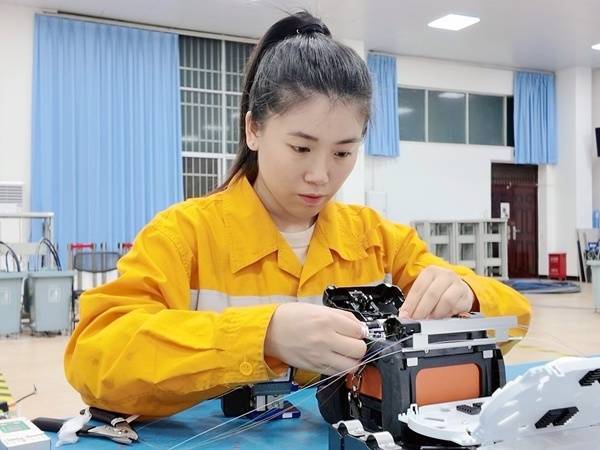 从那以后,培训基地成了莫慧玲的“第二宿舍”。光缆开剥、剪除加强芯、剥离松套管、清洁纤芯、切割、熔接、盘纤、装盒,她把光缆接续的一系列关键步骤拆解成“每日训练清单”,今天专攻“开剥力度控制”,明天聚焦“盘纤弧度”,遇到不懂的问题,就拿着笔记本去请教有现场经验的老师傅,哪怕对方处理完工作已经到了晚上,她也愿意等在车间门口。五个月里,她用掉的光缆加起来有2000多米,右手食指第二关节磨出了一层厚厚的茧子,指尖还残留着纤芯不经意扎入后留下的细小痕迹,原本细嫩的手掌也变得粗糙泛红。可就是这双历经打磨的手,渐渐有了“魔力”——0.125毫米的光纤在她指间,如同绣花针在绣布上穿梭般灵活。