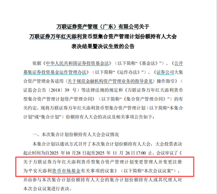 11月28日,万联证券公告,旗下万联证券万年红天添利货币型集合资产管理计划份额持有人大会表决结果暨决议生效,近96%持有人同意万联天添利货币资管计划变更管理人为平安基金,更名为“平安天添利货币市场基金”。